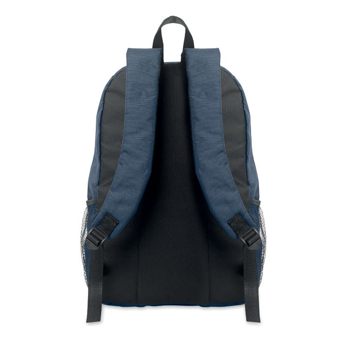 Rucksack mit Schnürung. Fronttasche mit Reißverschluss. Netztaschen auf beiden Seiten. 600D RPET-Polyester.