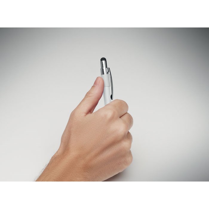 Druckkugelschreiber aus recyceltem Aluminium mit Stylus und Anti-Stress-Spinner-Funktion. Blaue Tinte.
