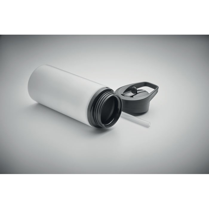 Einwandige Flasche aus recyceltem Edelstahl (90% recycelter Edelstahl und 10% Edelstahl). Klappbares Mundstück, Trinkhalm und Deckel mit Griff. Füllmenge: 500 ml.