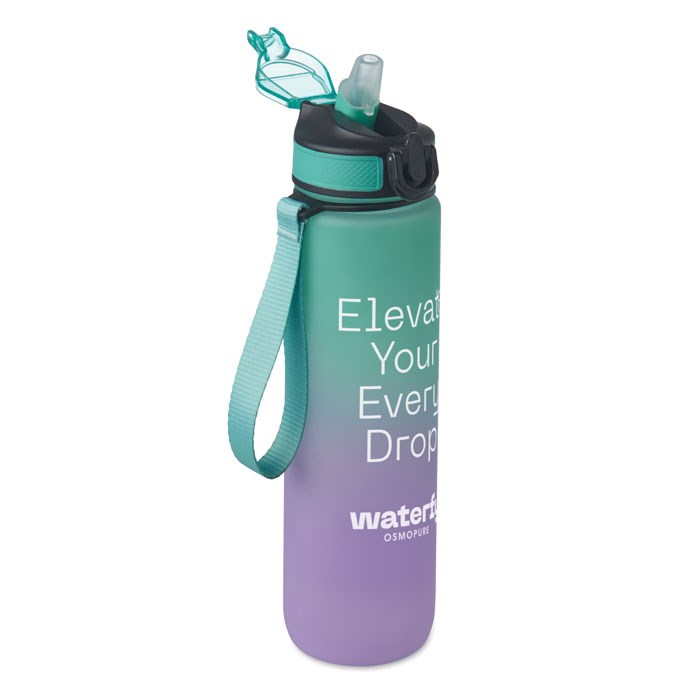 Sport-Trinkflasche aus RPET. Integrierter Trinkhalm, weiches Silikonmundstück, motivierende Zeitmarkierung, einhändig zu öffnender Flip-Top-Deckel, Sicherheitsverschluss und Schlaufe. Füllmenge: 1L.
