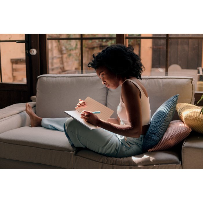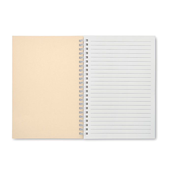 DIN A5 Notizbuch mit Cover aus recyceltem Karton. Weiche Kunststoff-Ringbindung. 80 Blatt (160 Seiten) liniertes Recyclingpapier.