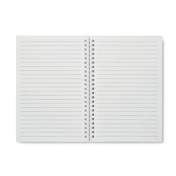 DIN A5 Notizbuch mit Cover aus recyceltem Karton. Weiche Kunststoff-Ringbindung. 80 Blatt (160 Seiten) liniertes Recyclingpapier.