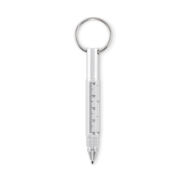 Schlüsselring mit Drehkugelschreiber aus recyceltem Aluminium, Stylus, Lineal 4 cm/1,5 Zoll und 2in1 Phillips- und Flachkopfschraubendreher. Schwarze Tinte.