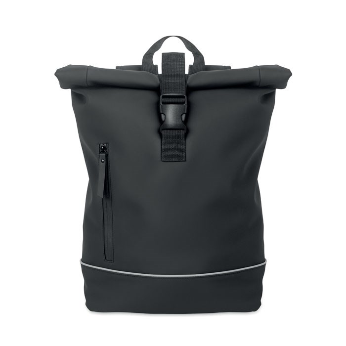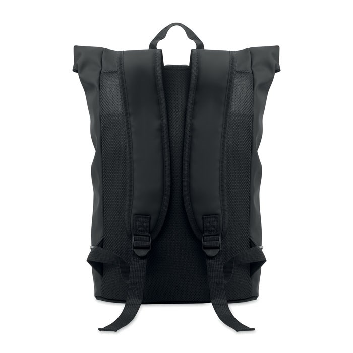 15'' Rolltop-Laptop-Rucksack aus weichem PU. Gepolsterter Rücken und verstärkter Boden mit reflektierenden Streifen. Wasserabweisende Fronttasche mit Reißverschluss. Futter aus 210D RPET-Polyester.