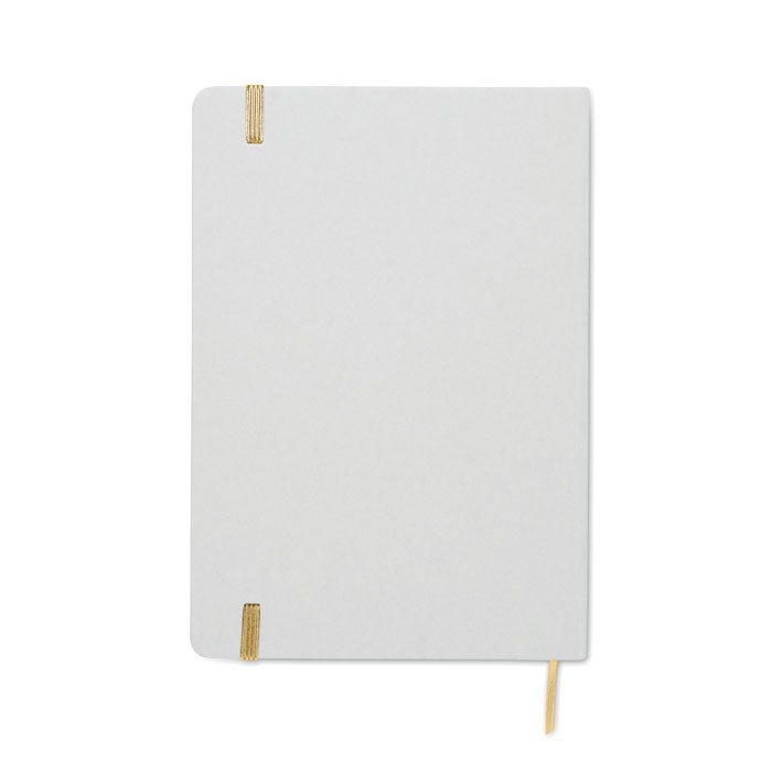 DIN A5 Notizbuch mit gebundenem Hard Cover aus 70% recyceltem Milchkarton und 30% recyceltem Papier. Weißes Cover. 80 Blatt (160 Seiten) liniertes Recyclingpapier. Nach der Gravur des Covers, wird die Farbe sichtbar. Farblich abgestimmtes elastisches Verschlussband und Lesebändchen.
