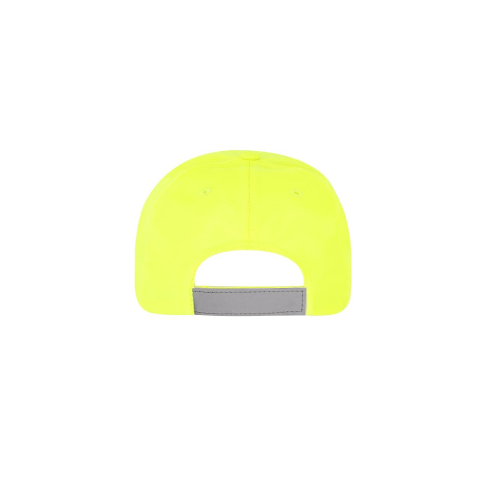 Sport Cap für Kinder aus weichem Polyester im zweifarbigen Design in fluoreszierendem Gelb mit reflektierendem Profil auf der Krempe und dem Verschluss. Klettverschluss und gestickte Belüftungsöffnungen.