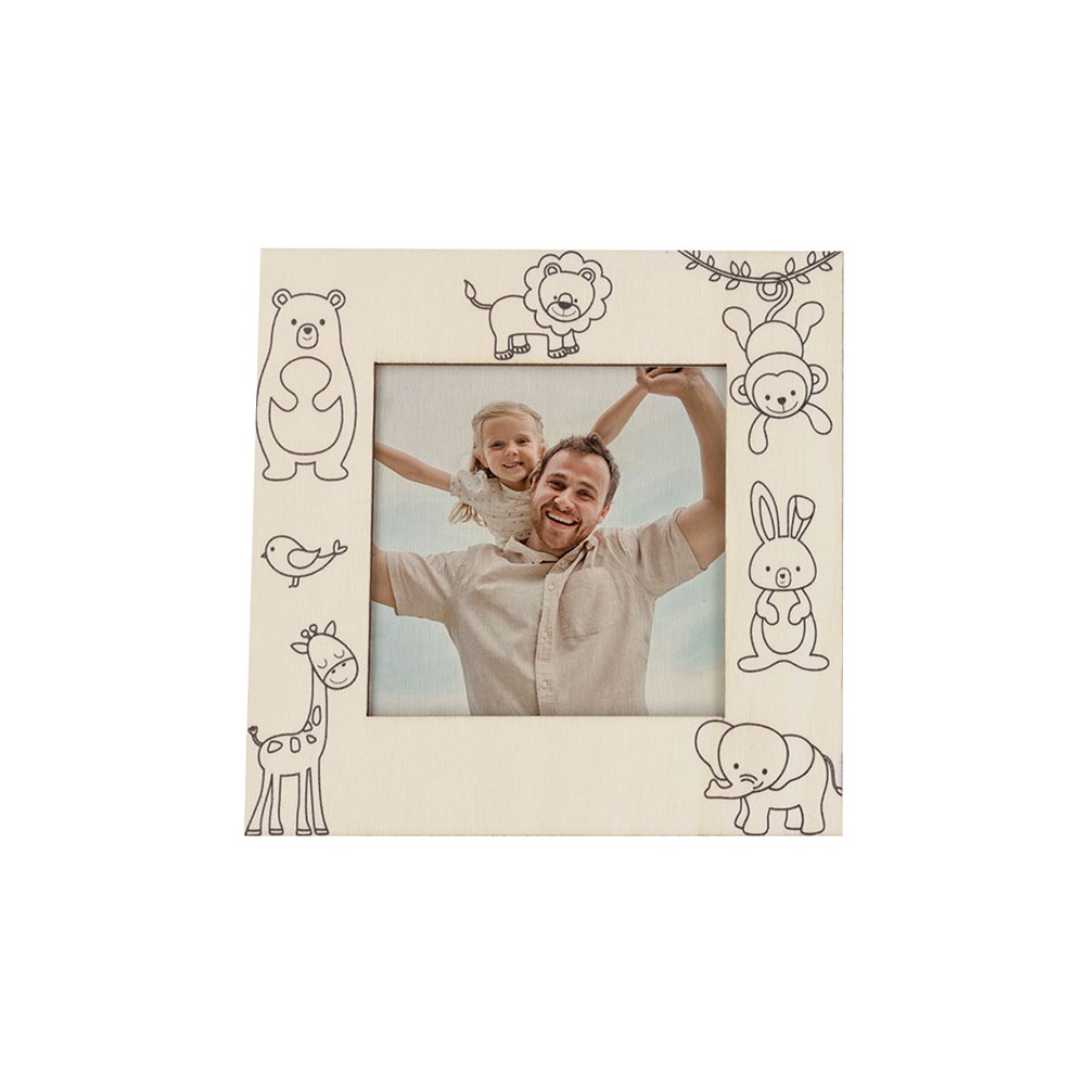Bilderrahmen aus Naturholz mit Tierdesign. Enthält Farbstifte zur Personalisierung und Dekoration des Rahmens. Entworfen für Fotos von 7,5x7,5 cm. Verfügt über eine praktische Rückwand mit Scharnier.