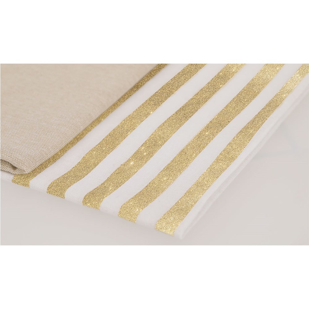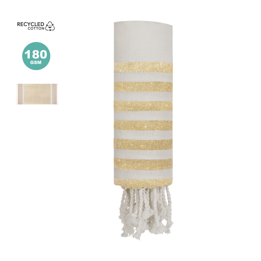 Bademantel in recycled Baumwolle von 180 g/m2. Gestreiftes Design in weißer Kombination mit glitzernden goldenen Streifen, Enden in glattem Beige und ausgefallenen Fransen an den Enden in Kordel-Optik. Enthält ein Etikett mit dem Logo für recycelte Baumwolle.