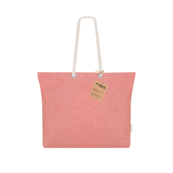 Tasche hauptsächlich aus recycelter Baumwolle von 220 g/m2 hergestellt. Mit Faltenboden und langen Baumwollgriffen in natürlichen Farben und geflochtenem Design. Enthält das Logo für recycelte Baumwolle.