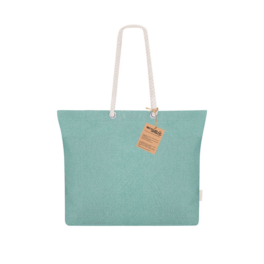 Tasche hauptsächlich aus recycelter Baumwolle von 220 g/m2 hergestellt. Mit Faltenboden und langen Baumwollgriffen in natürlichen Farben und geflochtenem Design. Enthält das Logo für recycelte Baumwolle.
