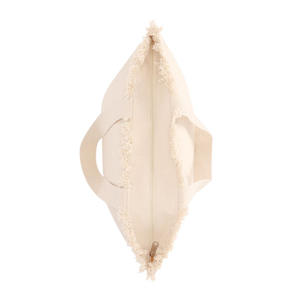Tasche im Fransen-Stil, hauptsächlich aus 320 g/m2 Baumwolle gefertigt. Mit praktischem und modernem Design, beinhaltet verstärkte lange Griffe. Enthält einen Reißverschluss für zusätzliche Sicherheit.
