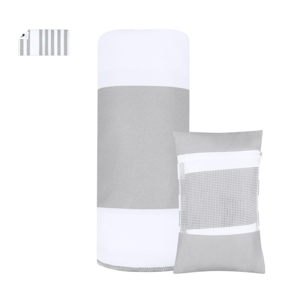 Handtuch mit wasserdichtem Fach und Hülle. Hergestellt aus weichem Polyester von 200 g/m2, enthält praktisches wasserdichtes Dreiecksfach in der Ecke, mit Reißverschluss, ideal um persönliche Gegenstände zu schützen. Sein gestreiftes Design wird durch eine Hülle mit Netz und Reißverschluss ergänzt.
