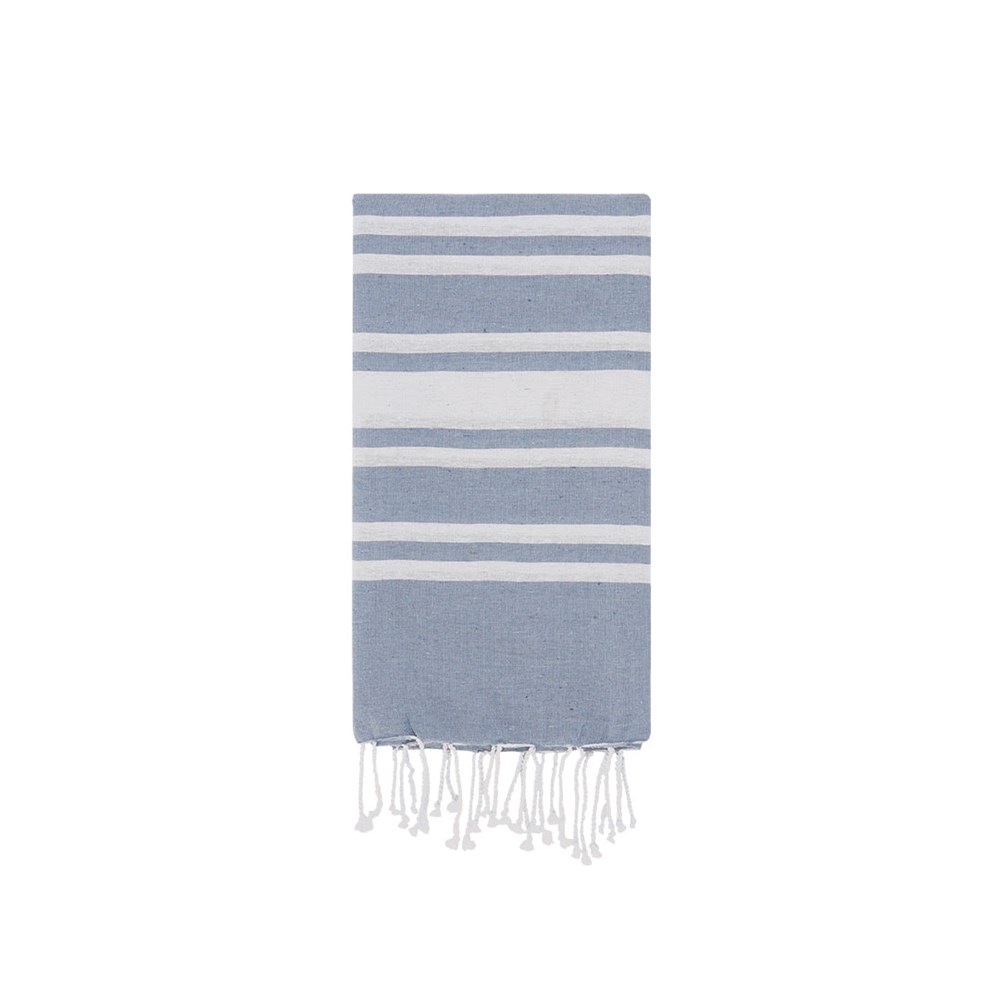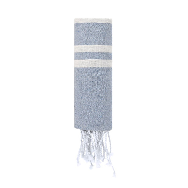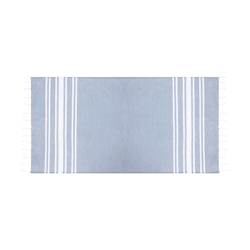 Weicher Pareo-Handtuch von 150 g/m2 in einer Kombination aus Baumwolle und Polyester. Sein Design hat einen bunten Hintergrund mit weißen Streifen. Enthält Fransen an den Enden, die ein dekoratives Detail hinzufügen und den Abschluss vervollständigen.