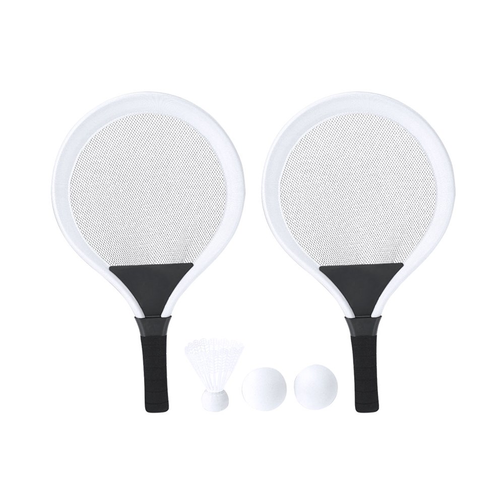 Set mit Schlägern. Enthält:- 2 Schläger mit ergonomischem Griff und gepolsterten Kanten, für einen bequemen und sicheren Halt während des Spiels.- 2 passende Bälle aus EVA-Material.- 1 Feder.Ideal für den Einsatz im Freien, sei es am Strand, im Park oder im Garten.
