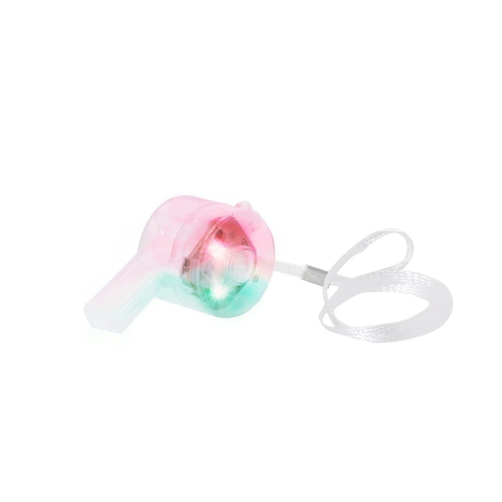 Leuchtpfeife mit mehrfarbigen LEDs, die mehrere Beleuchtungsmodi bietet: langsames, mittleres oder schnelles Blinken, angepasst an verschiedene Umgebungen. Inklusive praktischem Ein/Aus-Schalter. Inklusive Kordel für bequemen Transport und funktioniert mit drei Knopfzellen (inbegriffen).