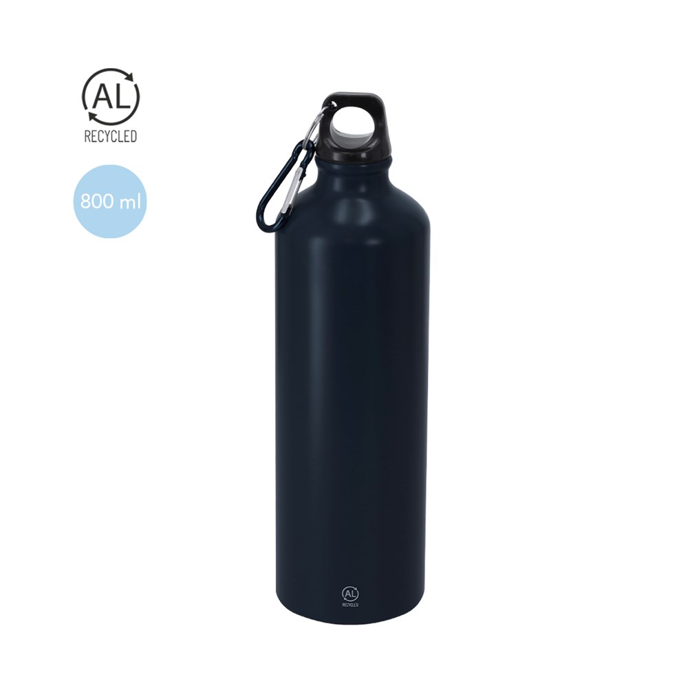 Flasche mit 800 ml Kapazität. Hergestellt aus strapazierfähigem und nachhaltigem recyceltem Aluminium. Mit schwarzem Schraubverschluss und passendem Karabiner für einfachen Transport. Körper mit mattierter Oberfläche. BPA-frei. Mit dem Markenzeichen Recycled Aluminium.Recyceltes Aluminium ist ein Material mit nahezu unendlichen Recyclingmöglichkeiten, ohne seine ursprünglichen Eigenschaften zu verlieren und verbraucht weniger Energie in diesem Prozess.