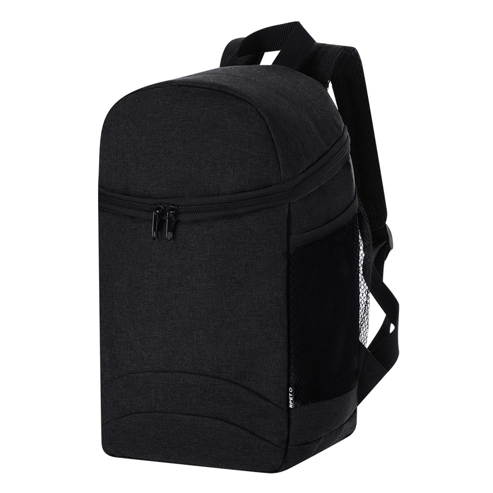 Große Kühlrucksack aus strapazierfähigem RPET 600D. Hauptfach mit Doppelschieber-Reißverschluss und Innenausstattung aus PEVA. Mit seitlichen Netztaschen. Verstellbare, gepolsterte Schultergurte. Enthält ein Band auf der Oberseite. Komplett gepolstert. Mit dem RPET-Merkmal auf dem Etikett.RPET-Material wird aus recyceltem Kunststoff hergestellt, um die Wiederverwendung von Kunststoffabfällen zu fördern und zur Nachhaltigkeit des Planeten beizutragen.