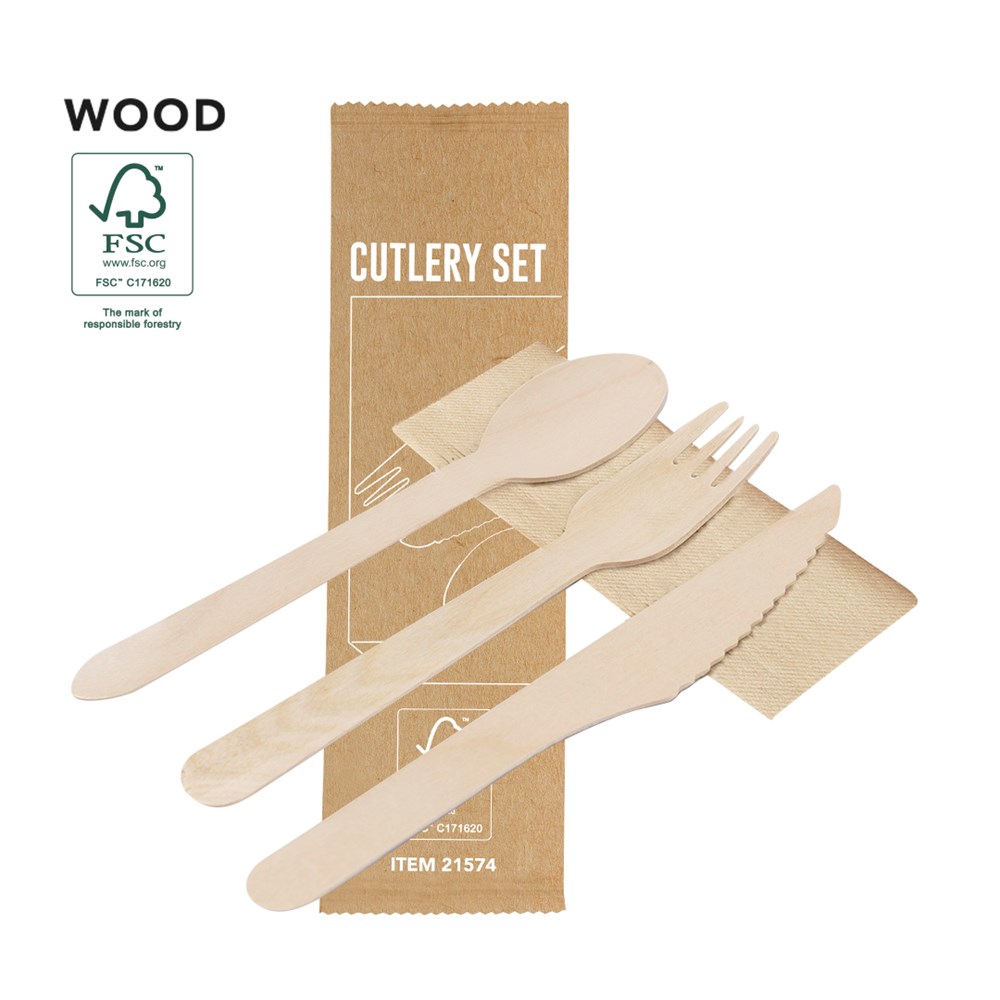 Set von 4-in-1 ökologischen Bestecken aus natürlichem Holz mit Serviette. Enthält: Löffel, Gabel, Messer und Kraftpapierserviette. Präsentiert in einer einzelnen Tasche.Hergestellt aus pflanzlichen Elementen zur Förderung der Verwendung von natürlichen Rohstoffen und zur Reduzierung der schädlichen Emissionen.