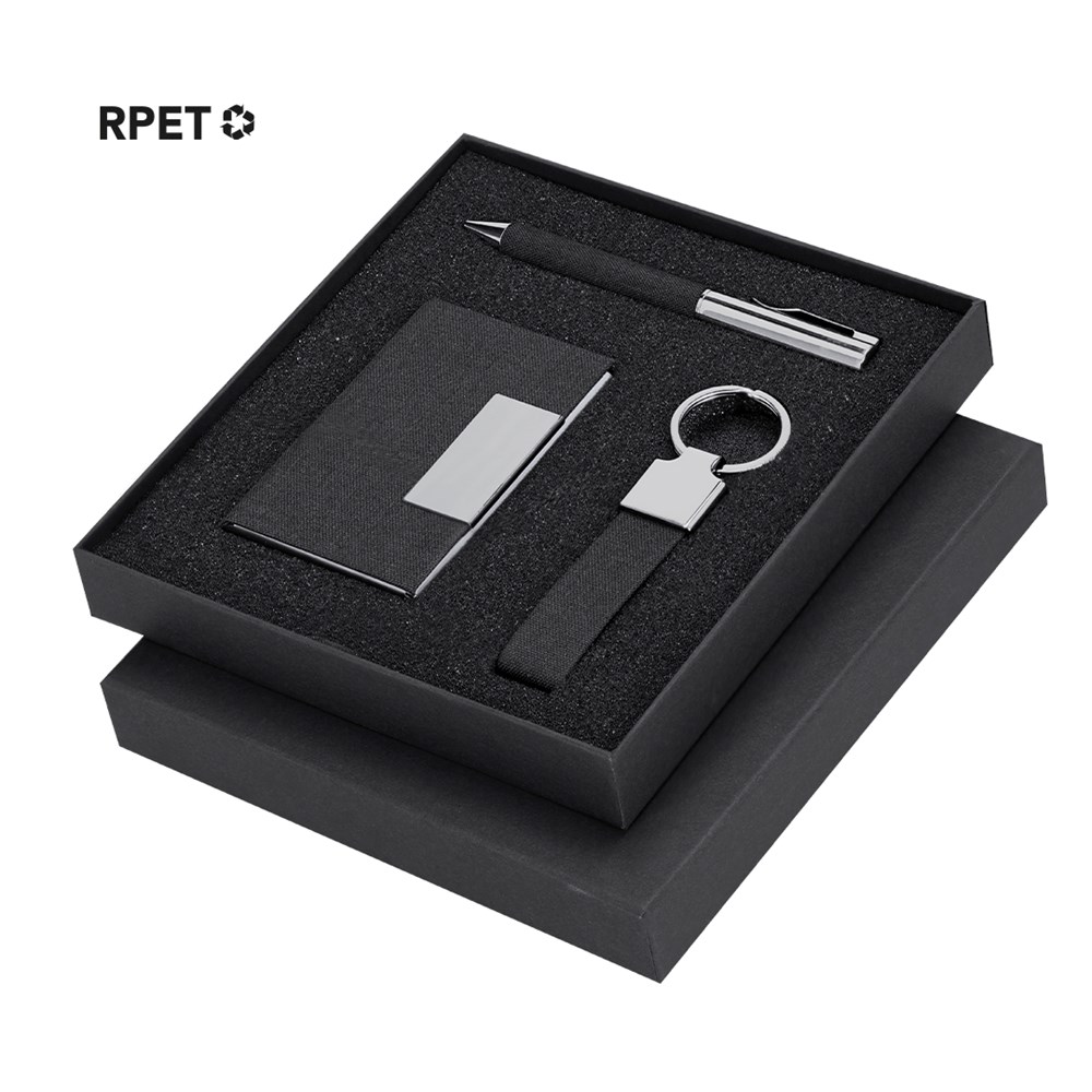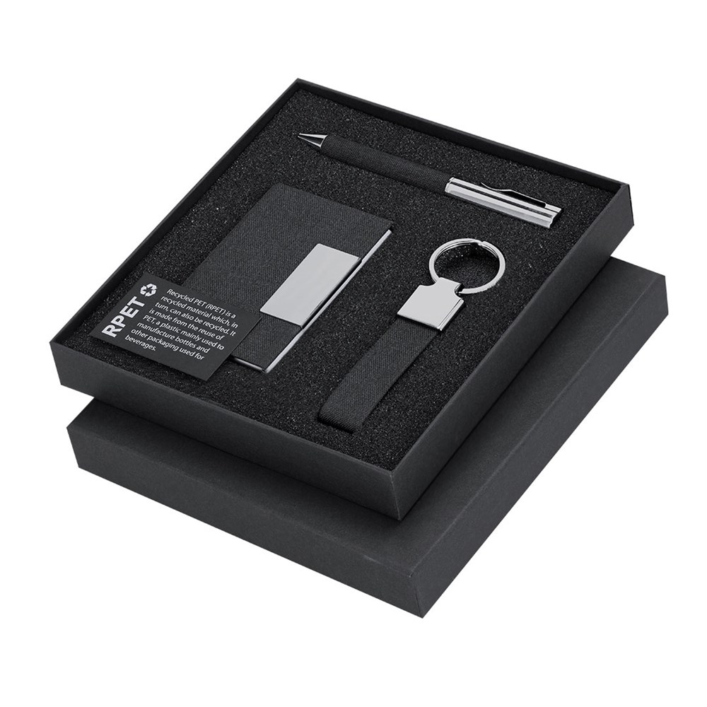 Elegantes Set aus RPET mit zweifarbiger schwarzer Oberfläche und metallischen Details. Enthält:-RPET-Kartenetui mit einem kombinierten zweifarbigen äußeren Schwarz und metallischen Details, 1 Innenfach und magnetischem Verschlusssystem.-RPET-Kugelschreiber in zweifarbiger schwarzer Ausführung mit metallischen Details. Mit Drehmechanismus und blauer Tinte.-RPET-Schlüsselanhänger in zweifarbiger schwarzer Ausführung mit verchromten Zubehör.Präsentiert in einer einzelnen schwarzen Verpackung. Enthält eine schwarze Innkarte mit RPET-Merkmal.Das RPET-Material wird aus recyceltem Kunststoff hergestellt, um die Wiederverwendung von Kunststoffabfällen zu fördern und zur Nachhaltigkeit des Planeten beizutragen.