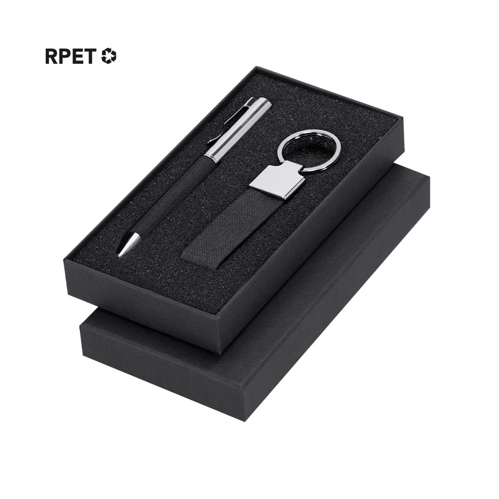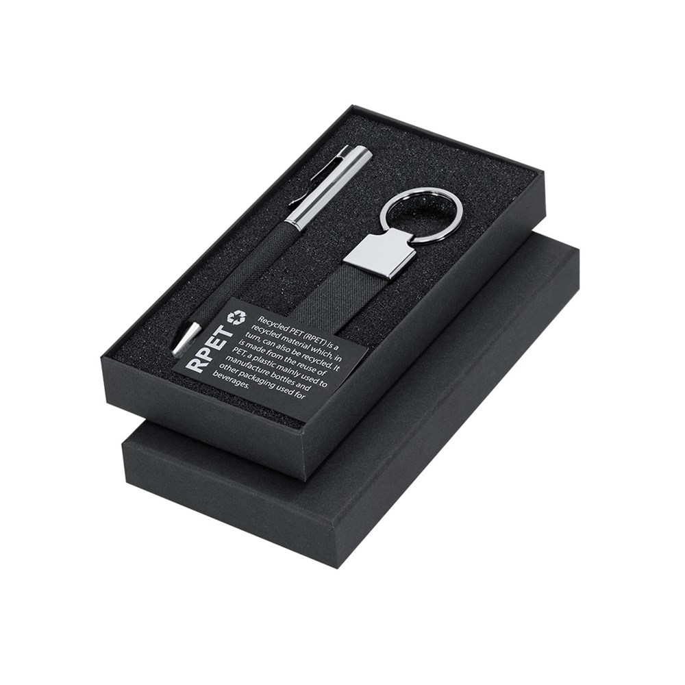 Elegantes Set aus RPET mit zweifarbiger schwarzer Oberfläche und metallischen Details. Enthält:-RPET-Kugelschreiber in zweifarbiger schwarzer Ausführung mit metallischen Details. Mit Drehmechanismus und blauer Tinte.-RPET-Schlüsselanhänger in zweifarbiger schwarzer Ausführung mit verchromten Zubehör.Präsentiert in einer einzelnen schwarzen Verpackung. Enthält eine schwarze Innkarte mit RPET-Merkmal.Das RPET-Material wird aus recyceltem Kunststoff hergestellt, um die Wiederverwendung von Kunststoffabfällen zu fördern und zur Nachhaltigkeit des Planeten beizutragen.