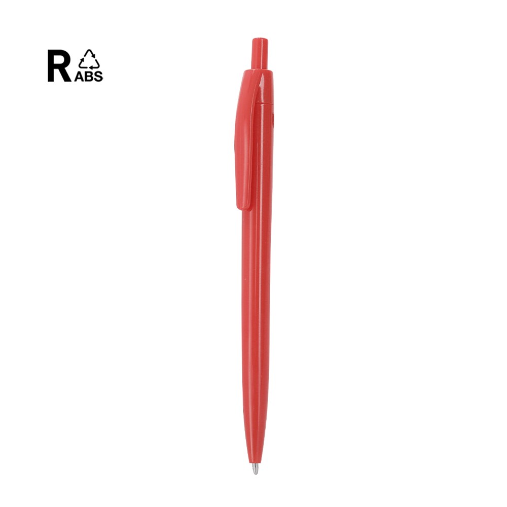 Kugelschreiber aus RABS. Druckmechanismus und blauer Tinte. RABS-Merkmal auf der Oberseite des Kugelschreibers.RABS ist ein hochgradig recycelbarer Kunststoff mit hoher Widerstandsfähigkeit und zahlreichen Anwendungen die ihn zu einer umweltfreundlichen Lösung machen.