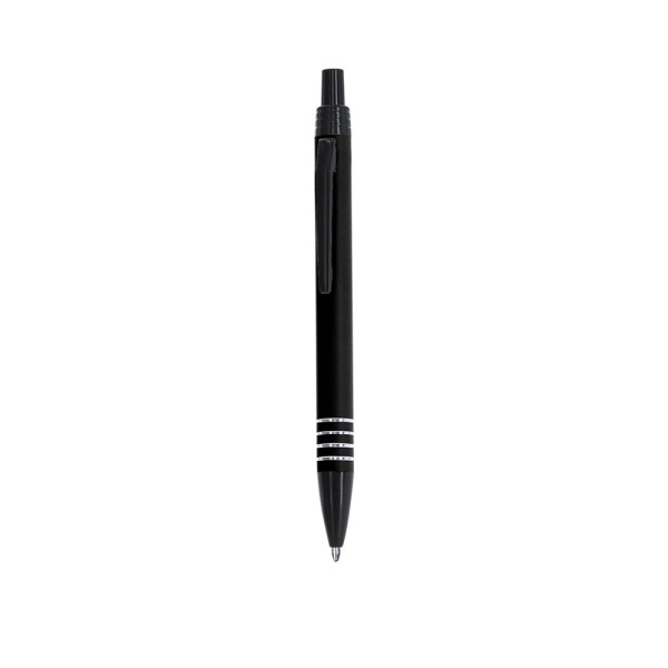 Kugelschreiber aus recyceltem Aluminium. Mit Druckmechanismus, Zubehör in schwarzer Farbe und silbernen Ringen. Jumbo-Patrone und blaue Tinte. Merkmal von recyceltem Aluminium auf der Oberseite.Recyceltes Aluminium ist ein Material mit fast unendlichen Recyclingmöglichkeiten, ohne seine ursprünglichen Eigenschaften zu verlieren und dabei weniger Energie in diesem Prozess zu verbrauchen.GRS-Zertifizierung (Global Recycled Standard), die den recycelten Ursprung des verwendeten Materials zur Herstellung des Produkts gewährleistet.