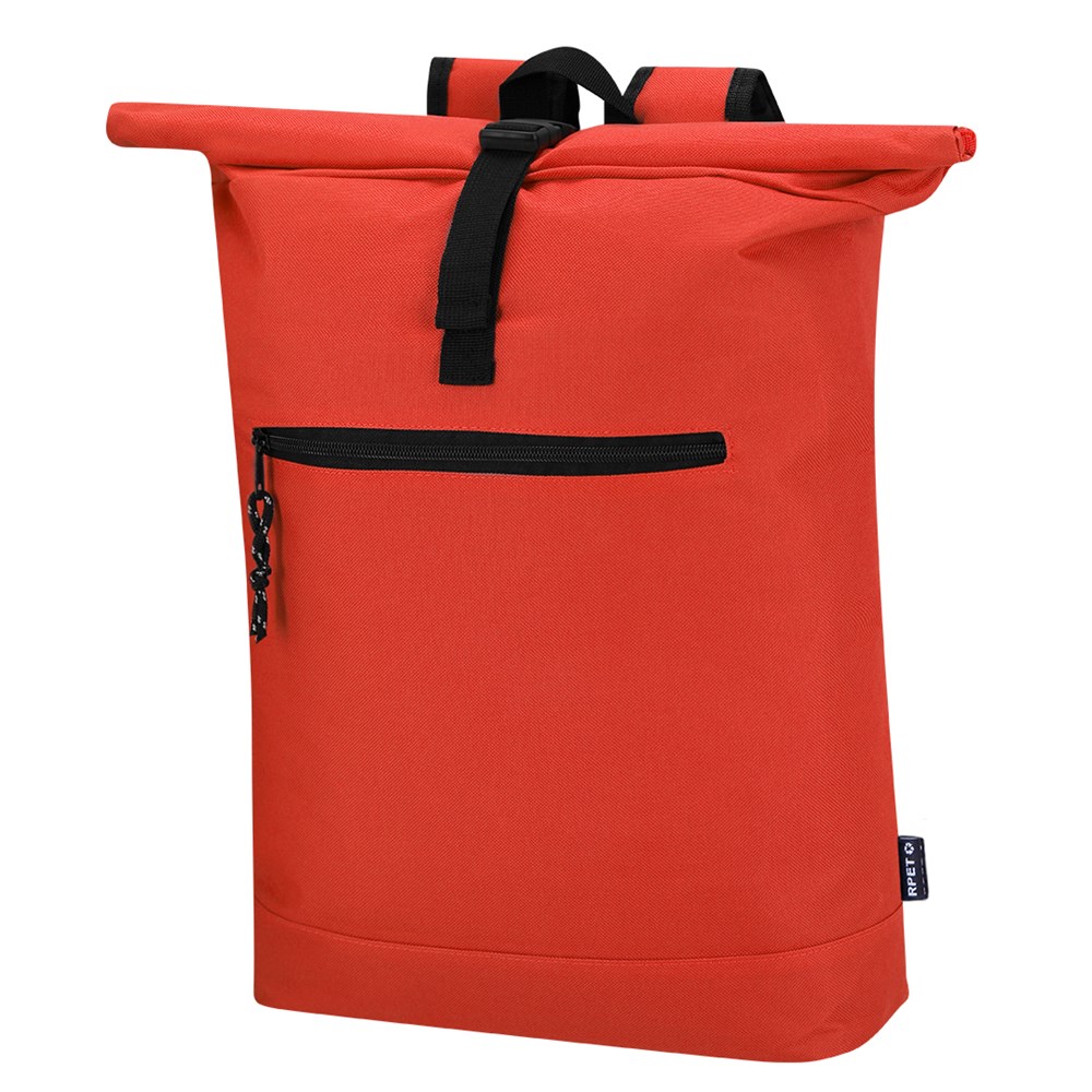 Rucksack aus widerstandsfähigem 600D RPET-Polyester. Hat ein Hauptfach mit einem Schnallenverschluss und einem gepolsterten Fach für Laptops bis zu 15 Zoll sowie eine zusätzliche Fronttasche mit Reißverschluss. Die Schultergurte sind gepolstert und verstellbar. RPET-Logo am Etikett und Zubehör in Schwarz. Das RPET-Material wird aus recyceltem Kunststoff hergestellt, um die Wiederverwendung von Plastikabfällen zu fördern und zur Nachhaltigkeit des Planeten beizutragen.