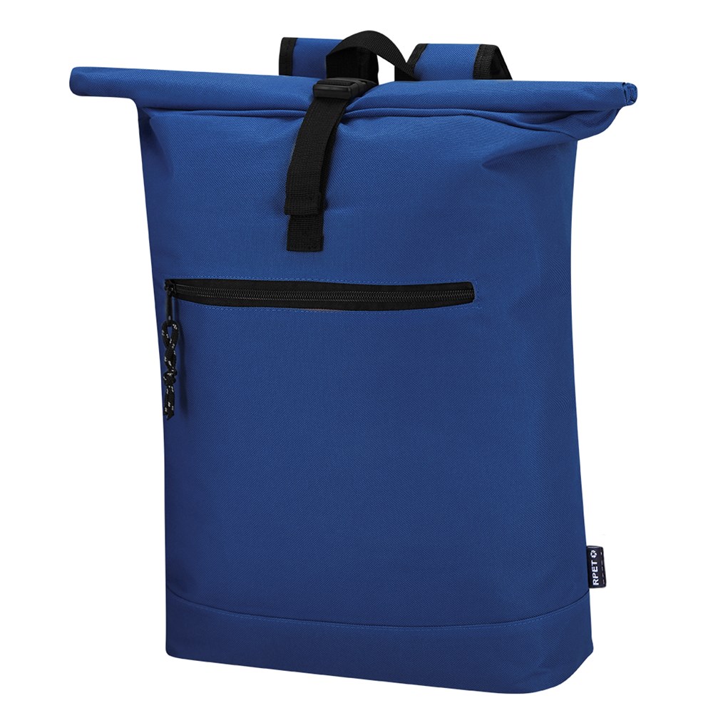 Rucksack aus widerstandsfähigem 600D RPET-Polyester. Hat ein Hauptfach mit einem Schnallenverschluss und einem gepolsterten Fach für Laptops bis zu 15 Zoll sowie eine zusätzliche Fronttasche mit Reißverschluss. Die Schultergurte sind gepolstert und verstellbar. RPET-Logo am Etikett und Zubehör in Schwarz. Das RPET-Material wird aus recyceltem Kunststoff hergestellt, um die Wiederverwendung von Plastikabfällen zu fördern und zur Nachhaltigkeit des Planeten beizutragen.