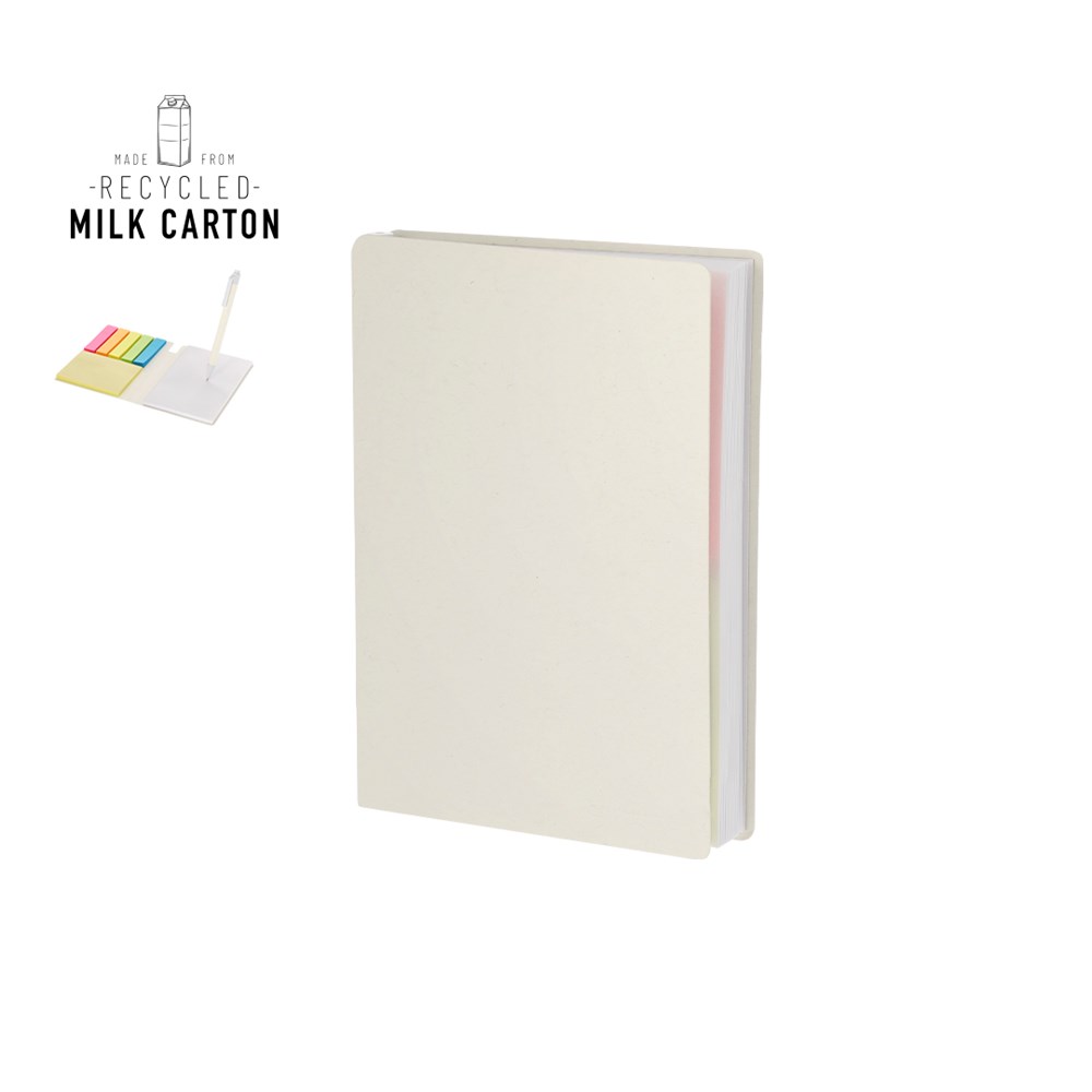 Notizblock aus recycelten Milchkartons mit Haftnotizen. Beinhaltet:- Passender Stift mit blauer Tinte, dessen Mechanismus integriert ist.- Integrierter Stifthalter.- Block mit 50 weißen Blättern.- Mittlere Haftnotizen und Mini-Haftnotizen in verschiedenen Farben. Enthält „Recycled Milk Carton“-Kennzeichnung. Die Milchkartons bestehen größtenteils aus Karton und Aluminium. Während des Recyclingprozesses werden die unterschiedlichen Materialien des Behälters getrennt, um wiederverwendet und neu eingesetzt zu werden, und tragen somit dazu bei, den unendlichen Weg der Kreislaufwirtschaft zu beschreiten. Dieses Material zeichnet sich durch einen hohen Recyclinggrad, sowie Leichtigkeit und Widerstandsfähigkeit aus.