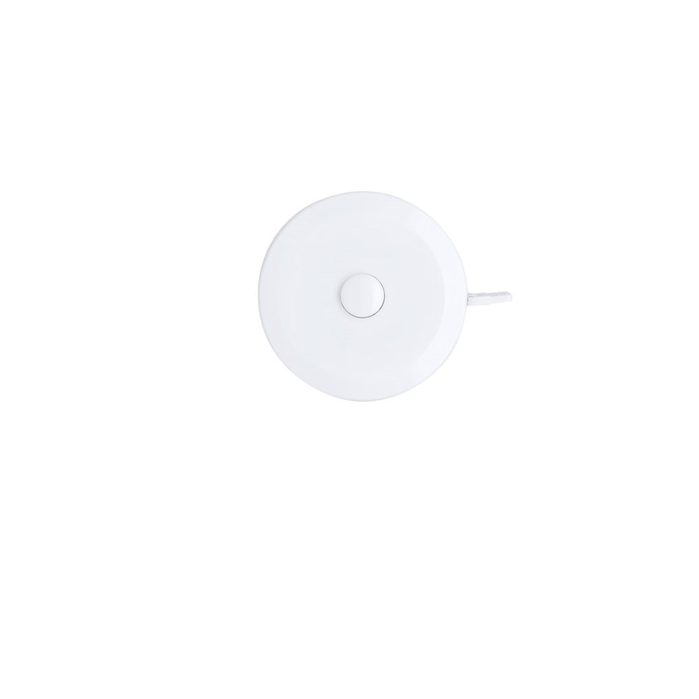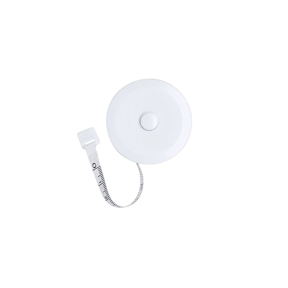 Maßband aus PVC mit einer Länge von 150 cm und einem Rückziehmechanismus mit Stopptaste. In Schwarz aufgedruckte Skala in cm und Zoll.