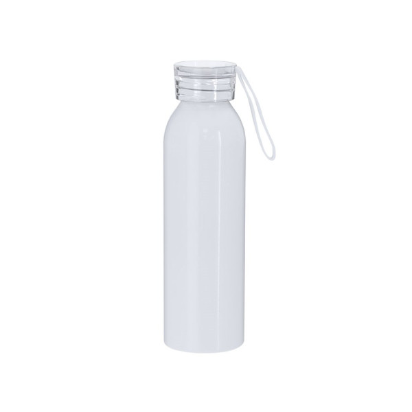 Kanister mit 650 ml Fassungsvermögen, aus robustem Aluminium. In glänzendem Weiß, speziell für Sublimationsdruck konzipiert. Mit transluzidem Schraubverschluss und passendem Tragegurt für einfachen Transport. BPA-frei.