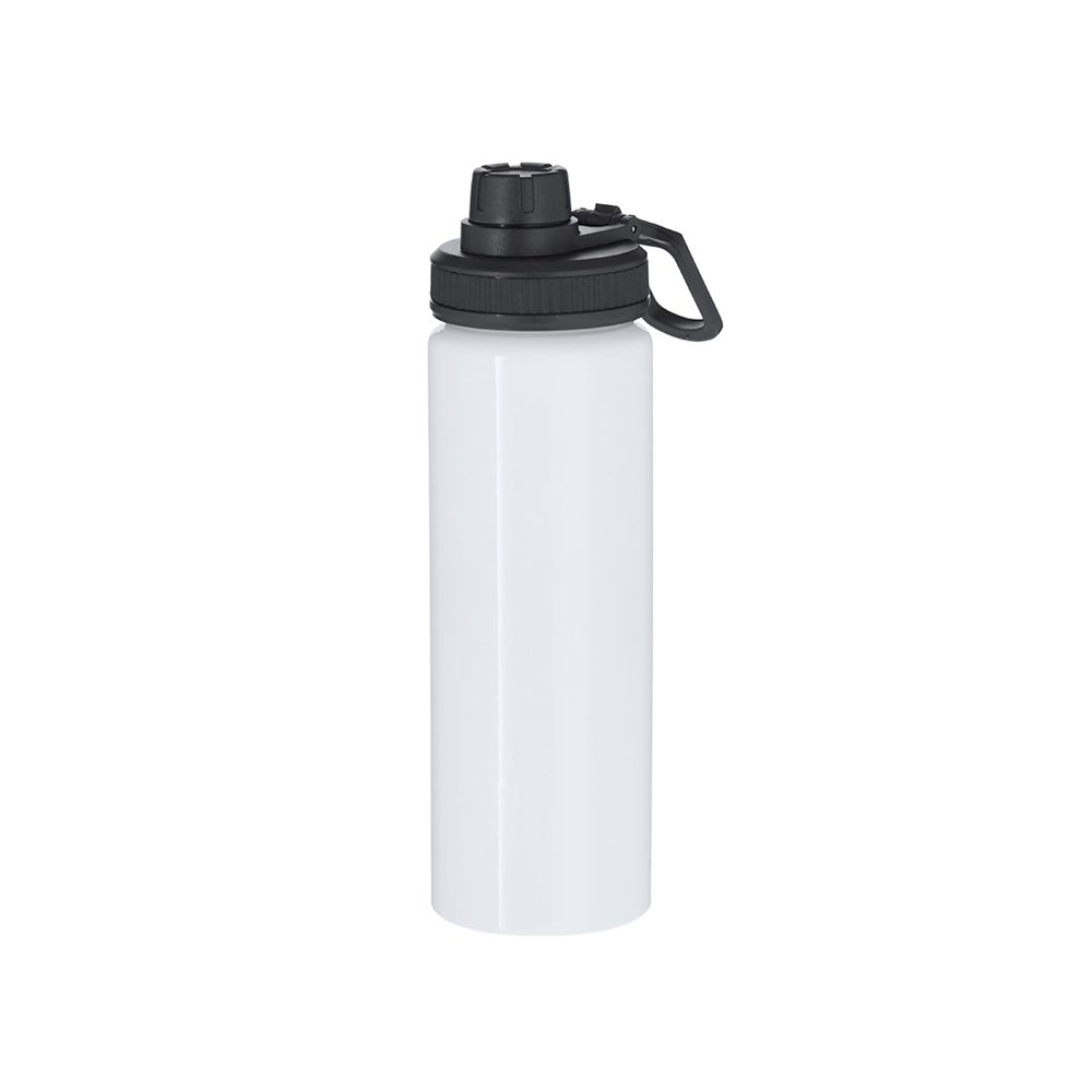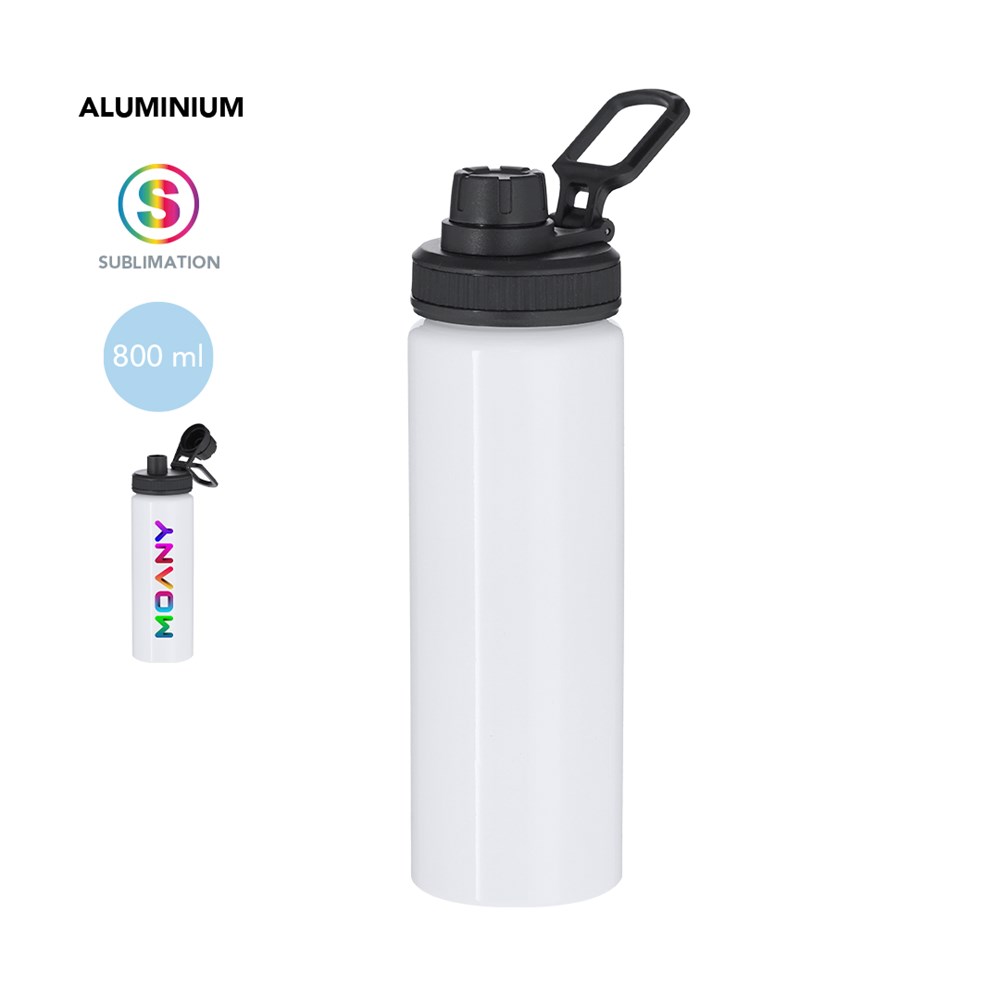Aluminiumkanister mit einem Fassungsvermögen von 800 ml. In glänzendem Weiß, speziell entworfen für Sublimationsdruck. Enthält einen schwarzen Deckel mit Schraubverschluss, grau Silikon-Griff für optimale Versiegelung, Dosierer und verstellbaren Tragegriff. BPA-frei.