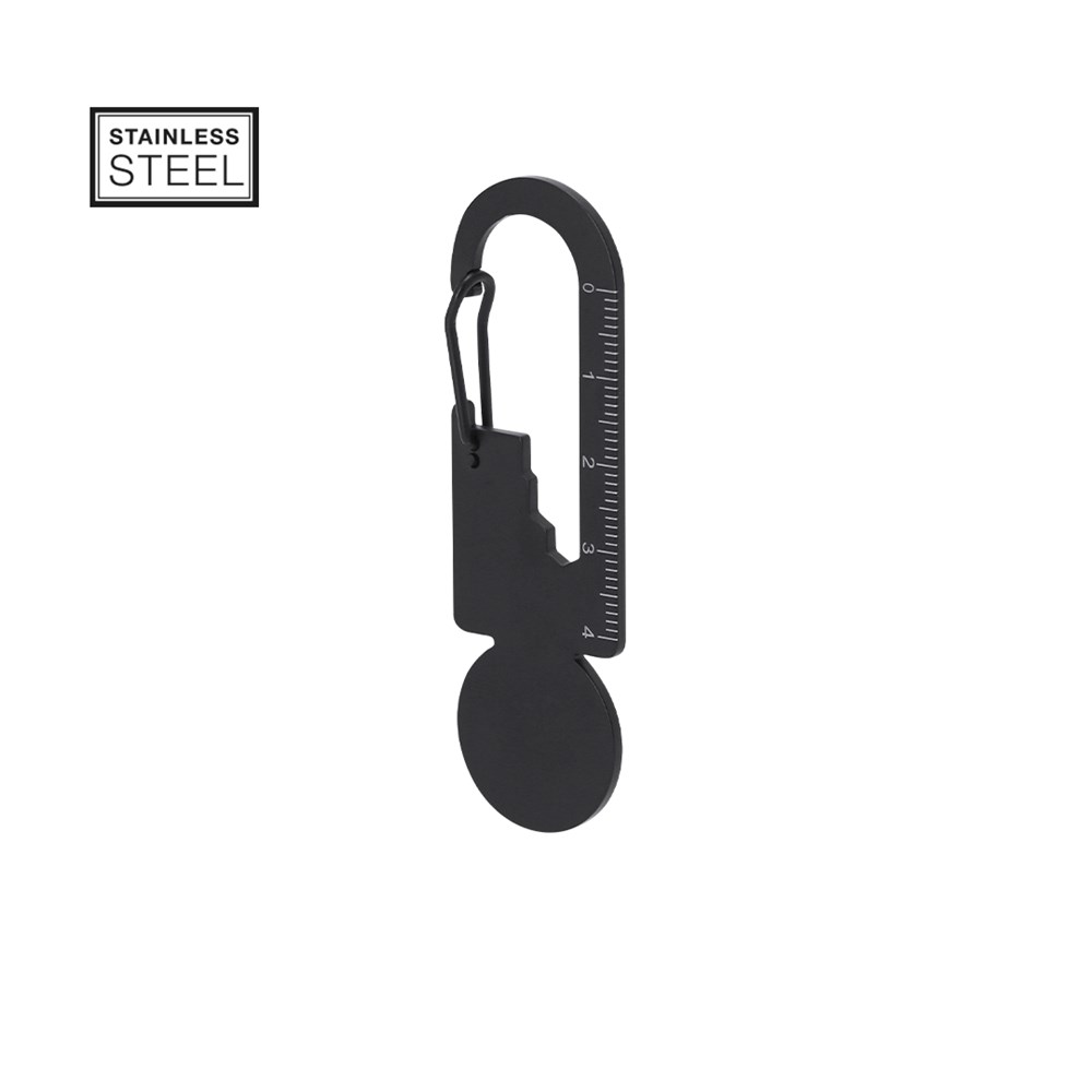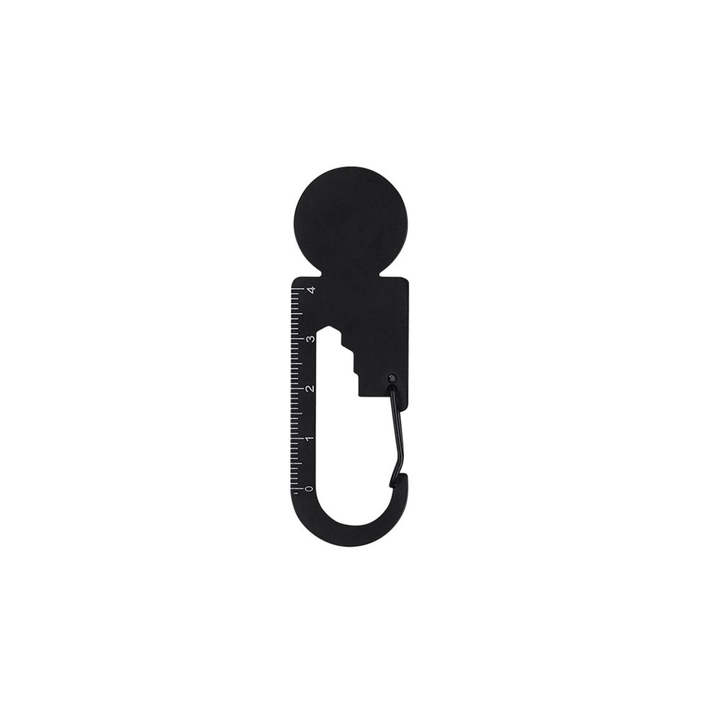 Multitool aus rostfreiem Stahl mit mattschwarzem Finish. Entworfen zur Anpassung an verschiedene Bedürfnisse, umfasst 8 Funktionen: Schlüssel für Sechskantmuttern in verschiedenen Größen, Maßstab für Messungen, Flaschenöffner, Münze für Einkaufswagen usw. Mit Karabinerverschluss.