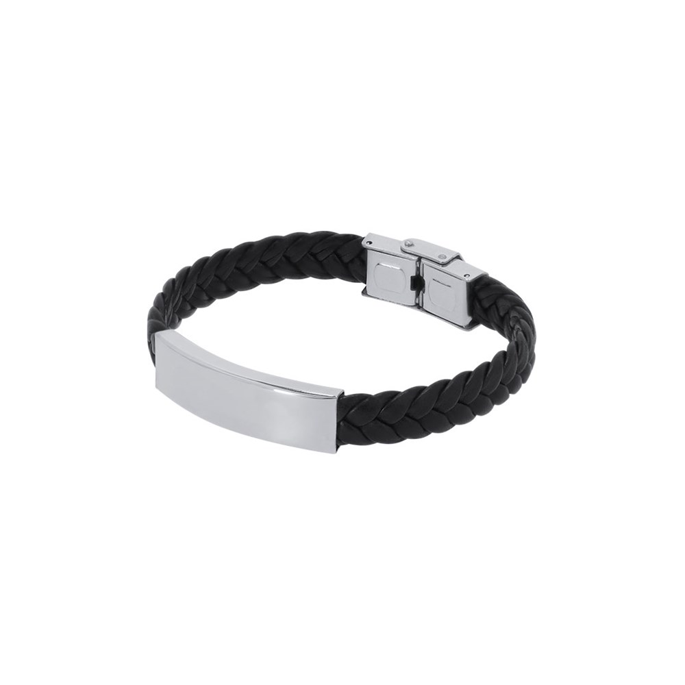 Schwarzes Kunstlederarmband mit einer Plakette aus poliertem Edelstahl in flachem Design. Verfügt über einen originellen Sicherheitsverschluss.