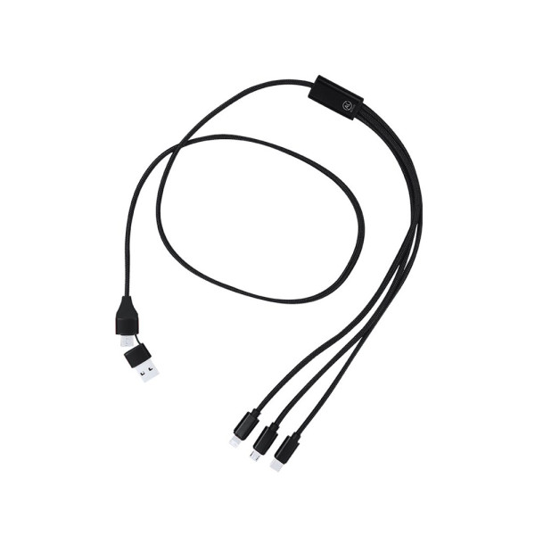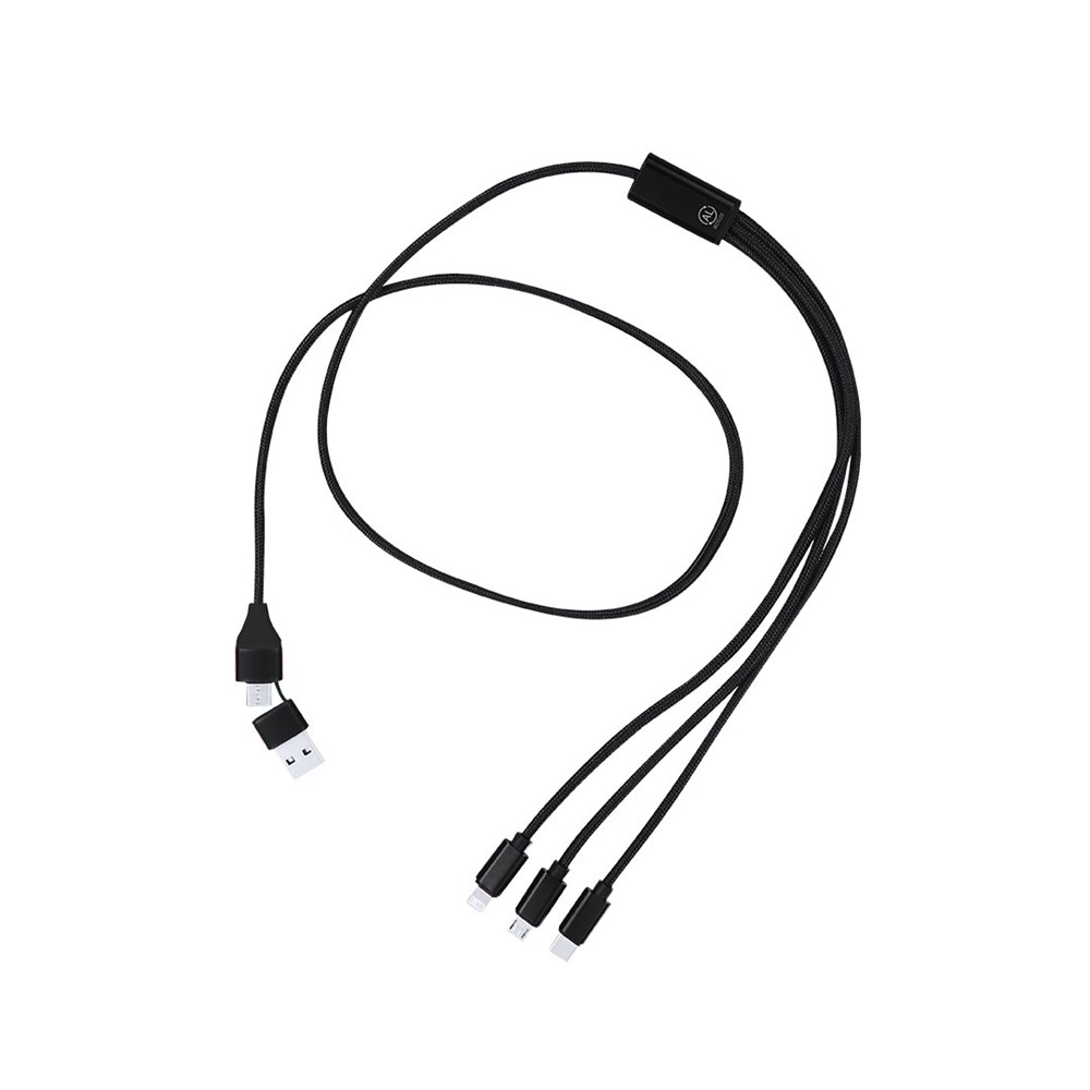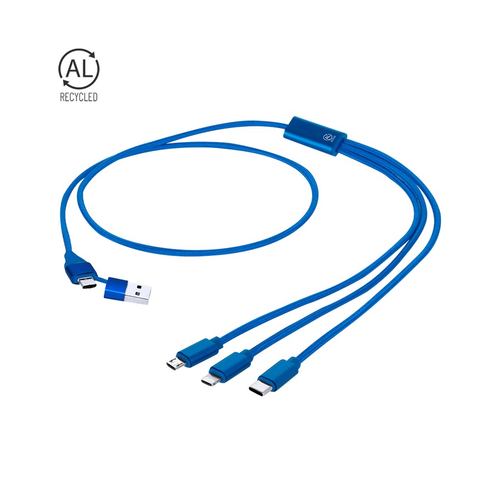 Ladekabel aus recyceltem Aluminium. Mit dualem Typ-C/USB-Eingang und Ausgängen Typ-C, Lightning und Micro-USB. Enthält ein Zeichen für recyceltes Aluminium.Recyceltes Aluminium ist ein Material mit nahezu unendlichen Recyclingmöglichkeiten, ohne dabei seine ursprünglichen Eigenschaften zu verlieren und weniger Energie in diesem Prozess zu verbrauchen.GRS-Zertifizierung (Global Recycled Standard), die die recycelte Herkunft des Materials garantiert, das zur Herstellung des Produkts verwendet wurde.Micro-USB-, Typ-C- und Lightning-Anschluss 5V DC 2.4A
