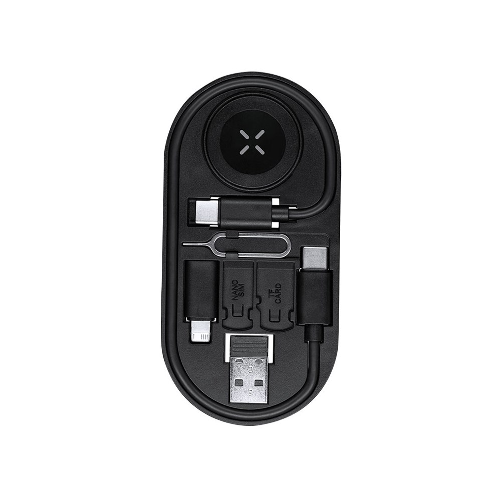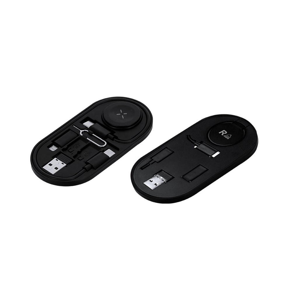 Set aus Ladekabeln aus recyceltem ABS (RABS). Enthält:- Drahtloses Laden für Smartwatch.- Multifunktionskabel mit USB-, Typ-C- und Lightning-Anschlüssen, kompatibel mit einer Vielzahl von Geräten und mit Datenübertragungsfähigkeit.- SIM-Ejektor mit Fächern für Lagerung von Nano SIM und TF-Karten.RAB ist ein hochgradig recycelbarer Kunststoff von großer Festigkeit und mit zahlreichen Anwendungen, der es zu einer umweltfreundlichen Lösung macht. Mit RCS-Zertifizierung, die die recycelte Herkunft gewährleistet und mit geprägtem RABS-Logo.