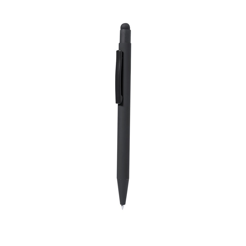 Stylischer Kugelschreiber aus Aluminium. Mit Druckmechanismus, spitzer und passendem Clip. Gummierte Oberfläche, speziell für Lasermarkierung entwickelt. Jumbo-Patrone mit blauer Tinte.