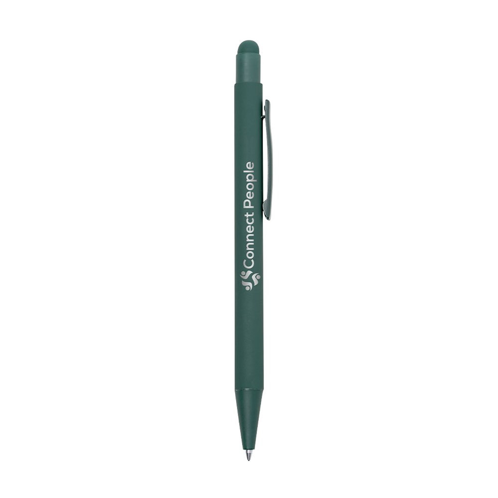 Stylischer Kugelschreiber aus Aluminium. Mit Druckmechanismus, spitzer und passendem Clip. Gummierte Oberfläche, speziell für Lasermarkierung entwickelt. Jumbo-Patrone mit blauer Tinte.