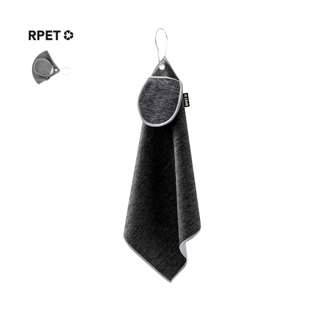 Golfhandtuch aus RPET mit doppelter Textur: sanfte, zweifarbige Oberfläche auf einer Seite und einheitlicher Faden auf der anderen, zur Anpassung an unterschiedliche Reinigungsbedarfe. Designt mit einer passenden Tasche für Golfbälle. Mit verstärktem Ring und Karabinerhaken. Enthält das RPET-Label auf dem Etikett.Das RPET-Material wird aus recyceltem Kunststoff hergestellt, um die Wiederverwendung von Kunststoffabfällen zu fördern und zur Nachhaltigkeit des Planeten beizutragen.