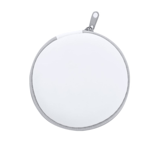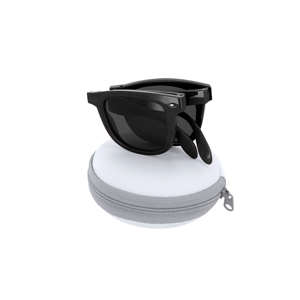 Faltbare Sonnenbrille mit UV400-Schutz, gefertigt aus recyceltem PC. Widerstandsfähiger Rahmen mit elegantem Design und glänzendem Finish in Schwarz. Die Gläser sind schwarz, um Stil zu garantieren. In einem weißen, runden Etui mit Reißverschluss verpackt.