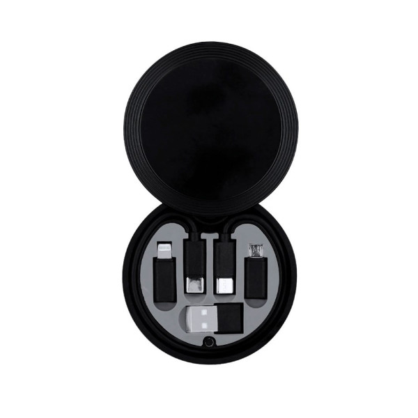 Set von Ladekabeln aus ABS. Enthält: Typ-C-Kabel, USB-Adapter, Micro USB-Adapter und 2-in-1-Adapter (Micro USB und Lightning). Präsentiert in einer Tasche mit Karabiner.