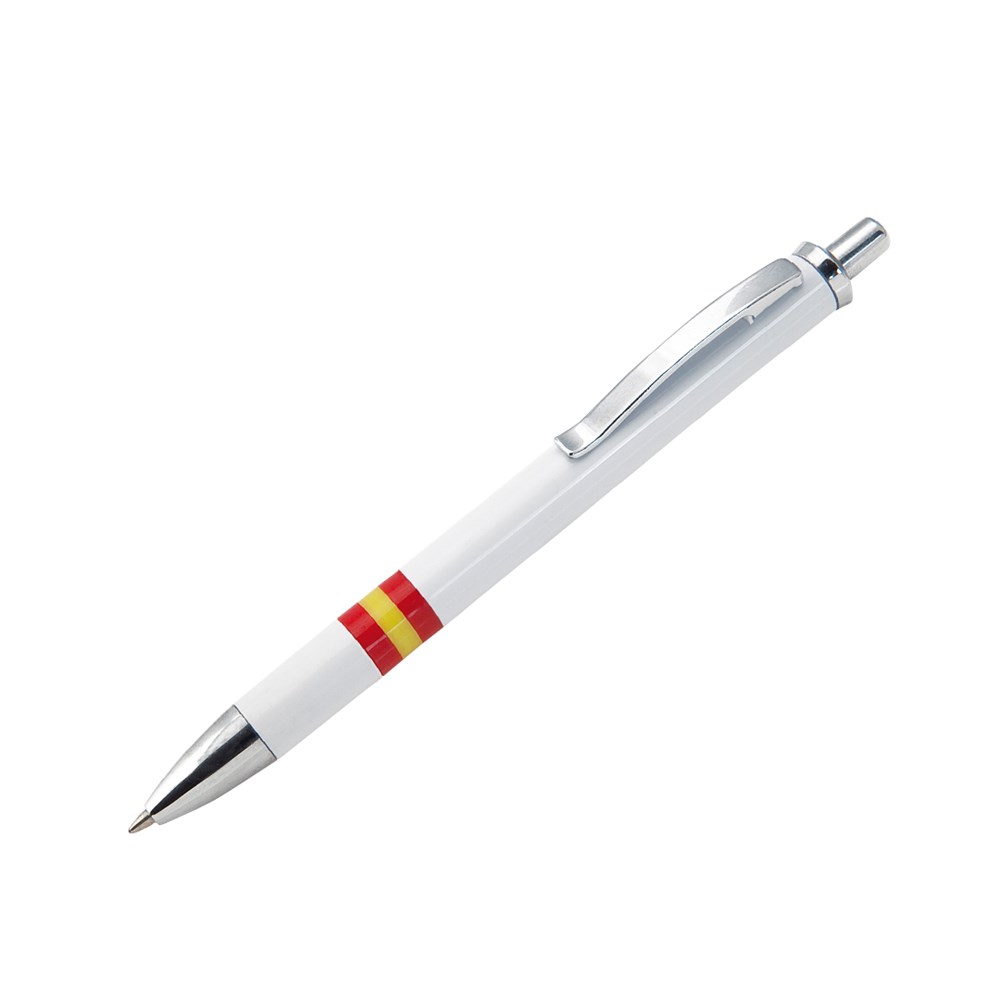 Druck-Kugelschreiber mit elegantem, zweifarbigem Design und Kontrastelementen in glänzendem Silber sowie Körper in glänzendem Weiß mit der spanischen Nationalflagge. Mit Metallclip und Jumbo-Patrone mit blauer Tinte.