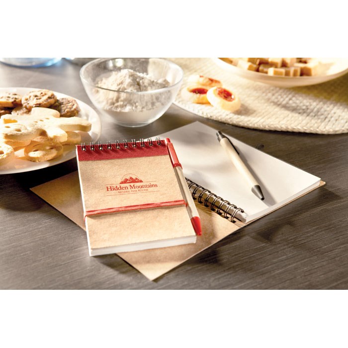 Notizbuch mit 70 Blatt (140 Seiten) recyceltem Blankopapier. Spiralbindung. Stiftschlaufe. Druckkugelschreiber aus recyceltem Karton mit Clip, Spitze und Drücker aus natürlich abbaubarem Kunststoff. Blaue Tinte.