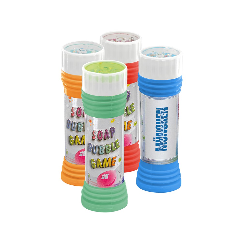 Flasche mit ca. 50 ml Lauge und Geduldspiel im Deckel, im Displaykarton, Standardmotiv "SoapBubble Game", mit Aufkleber Standard und Weißfläche für Werbedruck. Nicht geeignet für Kinder unter 3 Jahren!
