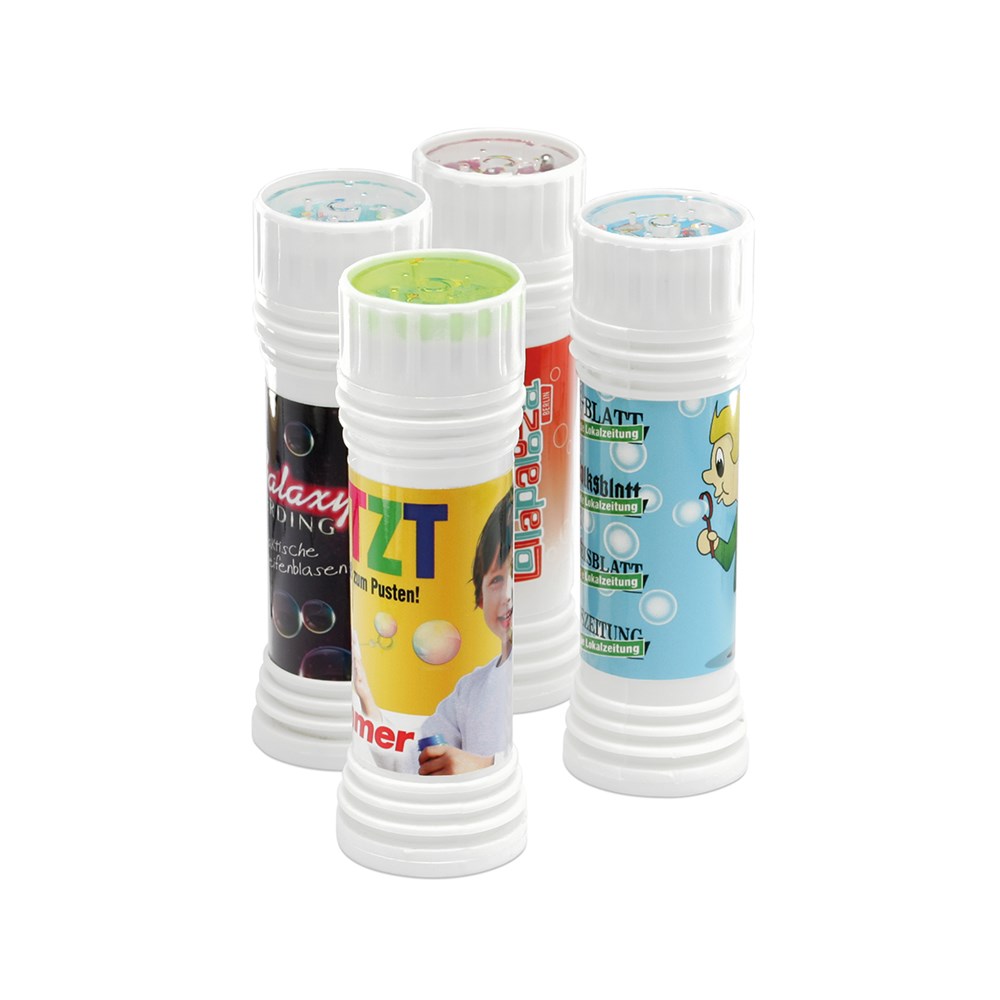 Flasche mit ca. 50 ml Lauge und Geduldspiel imDeckel, im Displaykarton, Standardmotiv "SoapBubble Game",mit individuellem Aufkleber. Nicht geeignet für Kinder unter 3 Jahren!