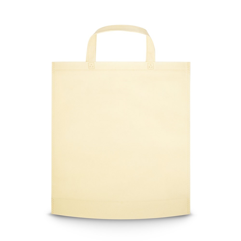 Tragetasche aus Non-Woven (80 g/m²), thermoversiegelt und mit 38 cm langen Henkeln. 380 x 415 x 85 mm