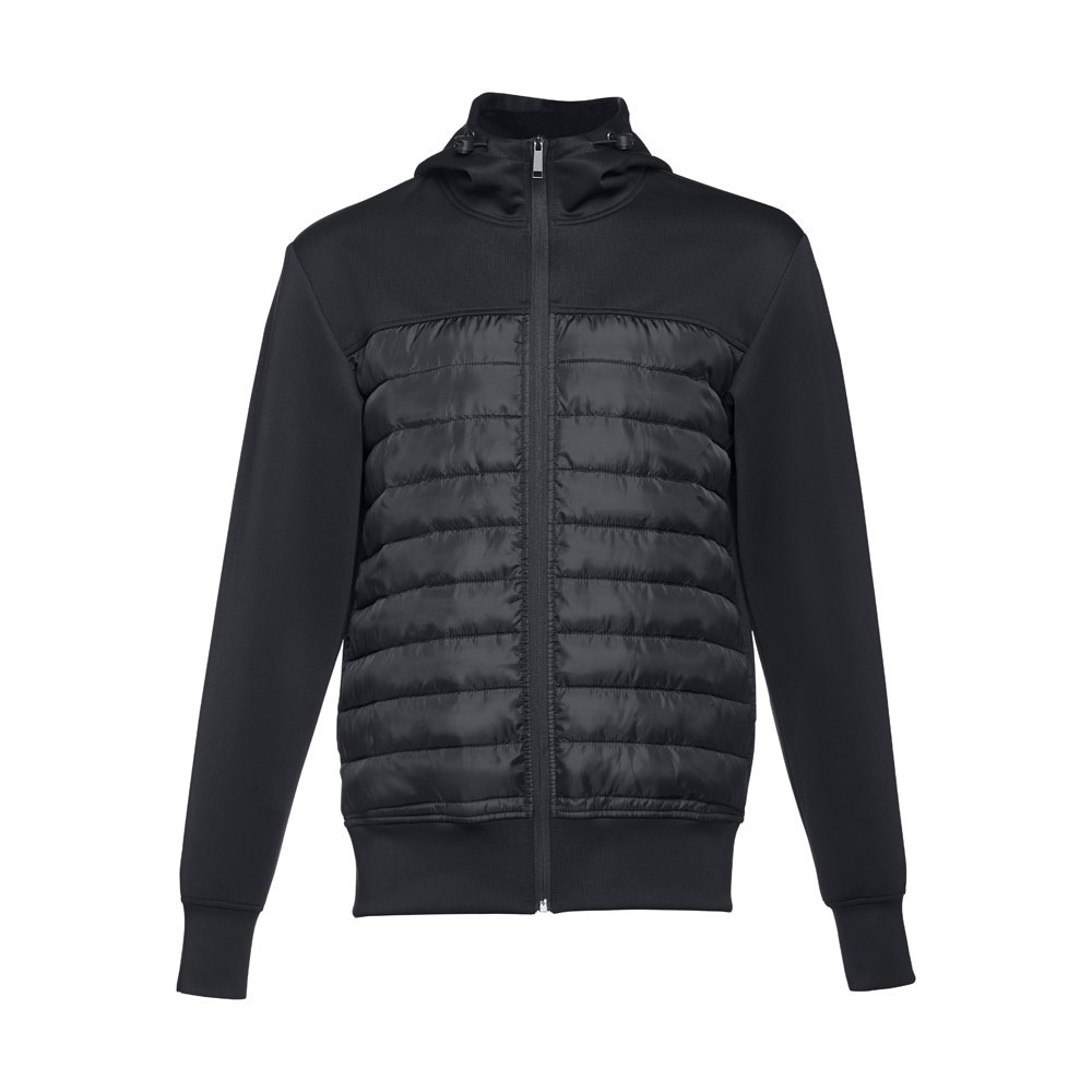 Herren Kapuzenjacke aus 300T Taft (280g/m²), 95% Polyester und 5% Elasthan. Der Schnitt und die Kombination unterschiedlicher Texturen verleihen dieser Jacke ein modernes Design. Die Kapuze kann mit den Stoppern angepasst werden. Die Innentaschen ermöglichen eine praktische Aufbewahrung. Größen: S, M, L, XL, XXL