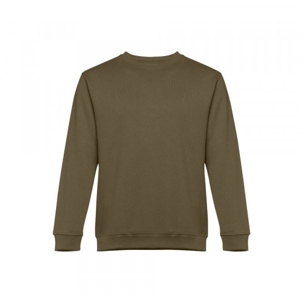 Sweatshirt aus 50% Baumwolle und 50% Polyester (300g/m²), unisex. Innen kardiert, 1x1 Ripp, Bund am Ärmel und Saum, Doppelnaht und Verstärkungsband am Kragen. Größen: S, M, L, XL, XXL