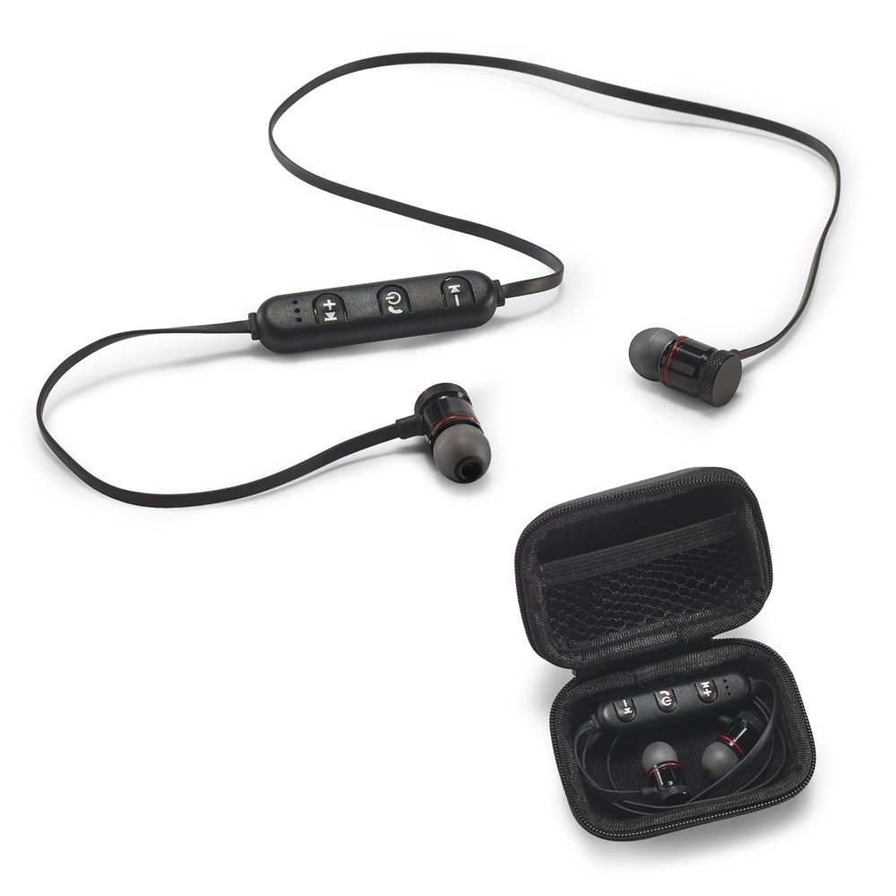 In-Ear Kopfhörer wireless und magnetisch aus recyceltem ABS (100 % rABS). Mit BT v4'1-Übertragung und einem 55-mAh-Akku bieten sie eine Autonomie von etwa 3 Stunden. Mit den Earphones können Sie Anrufe entgegennehmen, die Lautstärke und die Wiedergabeliste Ihres Mobilgeräts steuern. Inklusive USB-Ladekabel. Wird in einem EVA-Etui geliefert. 80 x 65 x 32 mm